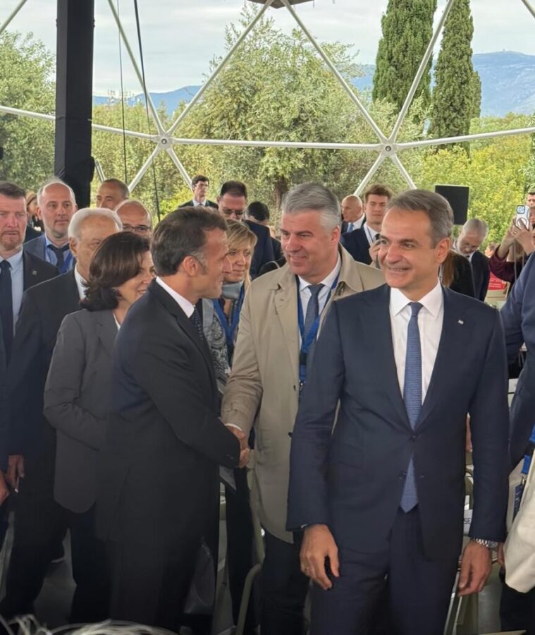 Το Ελληνογαλλικό Οικονομικό Φόρουμ στην Αθήνα είχε απ’ όλα. Είχε οράματα, είχε πράσινη μετάβαση, αλλά είχε και… Macron-grip. Ο Γάλλος Πρόεδρος, Emmanuel Macron, δεν χαιρετάει απλώς. Σε τσεκάρει στα σημεία. Ο Περιφερειάρχης ΑΜΘ, Χριστόδουλος Τοψίδης, κλήθηκε να αντιμετωπίσει τη διάσημη χειραψία-μέγγενη. Η φωτογραφία αποδεικνύει ότι ο Περιφερειάρχης άντεξε στην πίεση. Ο Κυριάκος Μητσοτάκης παρακολουθεί τη σκηνή με ένα αινιγματικό χαμόγελο. Ίσως σκέφτεται πως η διπλωματία θέλει γερά μπράτσα. Η στιγμή έγινε γρήγορα το θέμα της ημέρας στα  πολιτικά πηγαδάκια.
