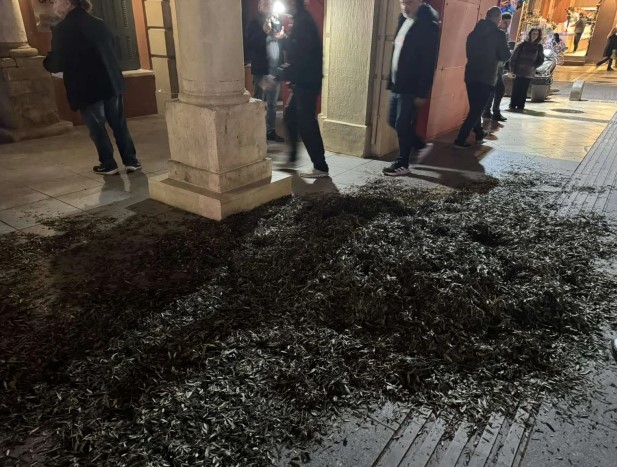 Φύλλα από ελιές πέταξαν έξω από την Περιφέρεια Κρήτης, αγροτοκτηνοτρόφοι, που πραγματοποίησαν νωρίτερα απόψε διαμαρτυρία στο Ηράκλειο.