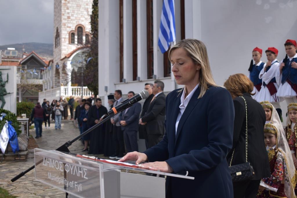 “Σήμερα γιορτάζουμε την ημέρα που οι Έλληνες ξεκίνησαν τον μεγάλο αγώνα για την Ανεξαρτησία από την Οθωμανική Αυτοκρατορία. Μια ημέρα γεμάτηθάρρος, πίστη και αγάπη για την πατρίδα, που μας θυμίζει ότι η ελευθερία δεν χαρίζεται, κατακτιέται με αγώνα και θυσίες”, τόνισε η Αντιδήμαρχος Φυλής Ελένη Λιάκου εκφωνώντας τον Πανηγυρικό λόγο της Ημέρας. Εστιάζοντας στο Δήμο Φυλής και τους κατοίκους του, η Αντιδήμαρχος επεσήμανε ότι ο Δήμος έχει μακραίωνη ιστορία και διατηρεί ζωντανή τη μνήμη των προγόνων που αγωνίστηκαν για την ελευθερία και τη διατήρηση των ελληνικών παραδόσεων, ενώ και οι κάτοικοι τη περιοχής έχουν κληρονομήσει την αγάπη για την πατρίδα και την αλληλεγγύη. “Η ελευθερία που απολαμβάνουμε σήμερα προέρχεται από την τόλμη αυτών των ανθρώπων, που δεν δίστασαν να θυσιάσουν τα πάντα για να ζούμε εμείς σε έναν ελεύθερο τόπο”, υπογράμμισε η Ελένη Λιάκου, τονίζοντας ότι η σημερινή μέρα “μας δίνει την ευκαιρία να διδάξουμε στα παιδιά μας την αξία της δημοκρατίας, της κοινότητας και της ιστορικής μνήμης”. Μια κληρονομιά που μας άφησαν οι πρόγονοί μας και την οποία πρέπει να κρατήσουμε ζωντανή “μέσα από την εκπαίδευση, τις τοπικές παραδόσεις και τη συμμετοχή μας σε κάθε κοινό έργο που ενώνει τους ανθρώπους”, επεσήμανε η Αντιδήμαρχος καταλήγοντας “ας δείξουμε ότι οι κάτοικοι της Φυλής τιμούμε τις θυσίες των ηρώων και συνεχίζουμε τον αγώνας τους με πράξεις καθημερινής αλληλεγγύης και προσφοράς”.