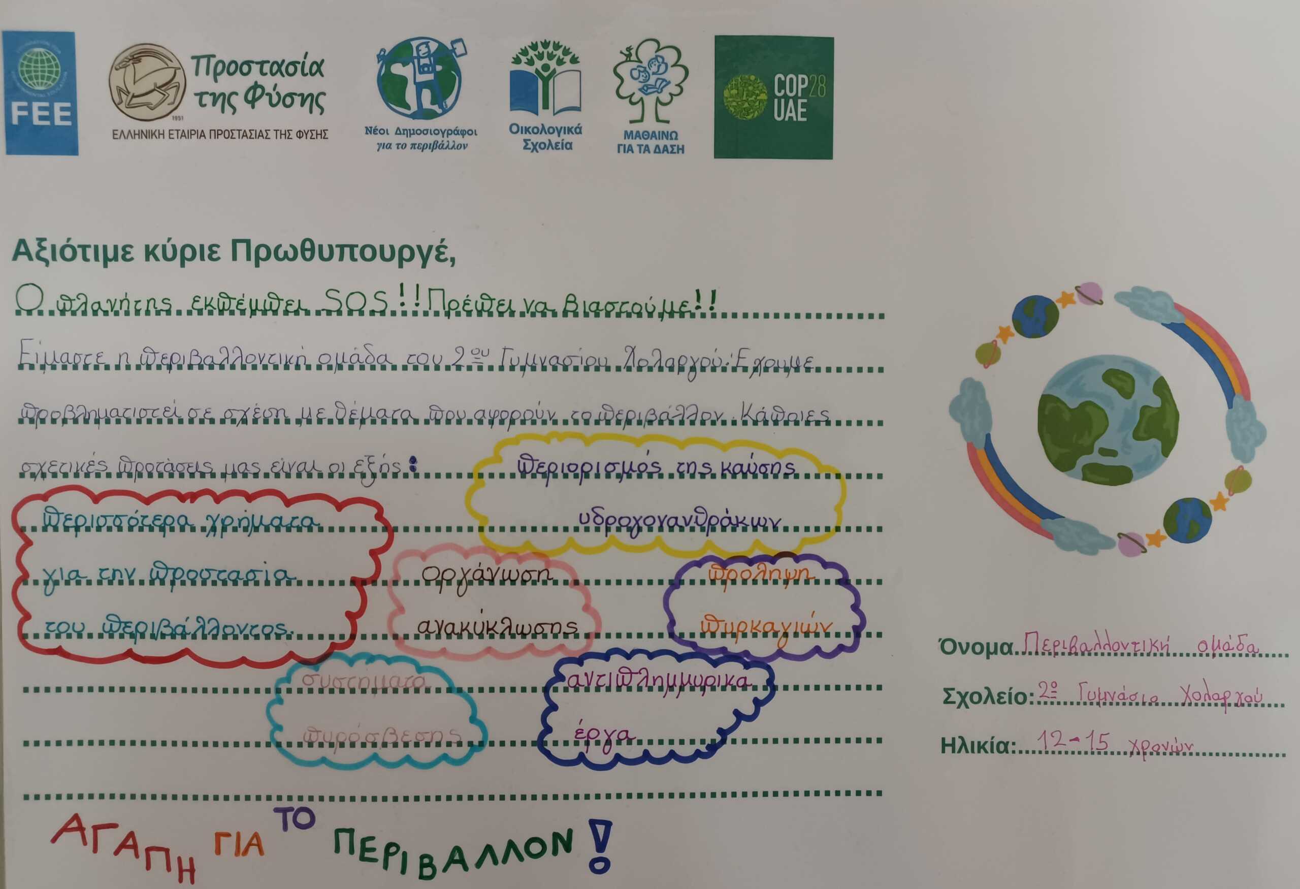 Ενόψει αυτής της πολύ σημαντικής παγκόσμιας συνάντησης, η Ελληνική Εταιρεία Προστασίας της Φύσης κάλεσε όλο το μαθητικό κοινό που συμμετέχει στα εκπαιδευτικά της δίκτυα να μεταφέρει, με τον δικό του πρωτότυπο λόγο, τις ανάγκες, τις εκκλήσεις, αλλά και το αισιόδοξο μήνυμά του για το περιβάλλον, την κλιματική αλλαγή και την προστασία της φύσης, στον Κυριάκο Μητσοτάκη, ο οποίος συμμετείχε στην COP28, που πραγματοποιείται στα Ηνωμένα Αραβικά Εμιράτα.