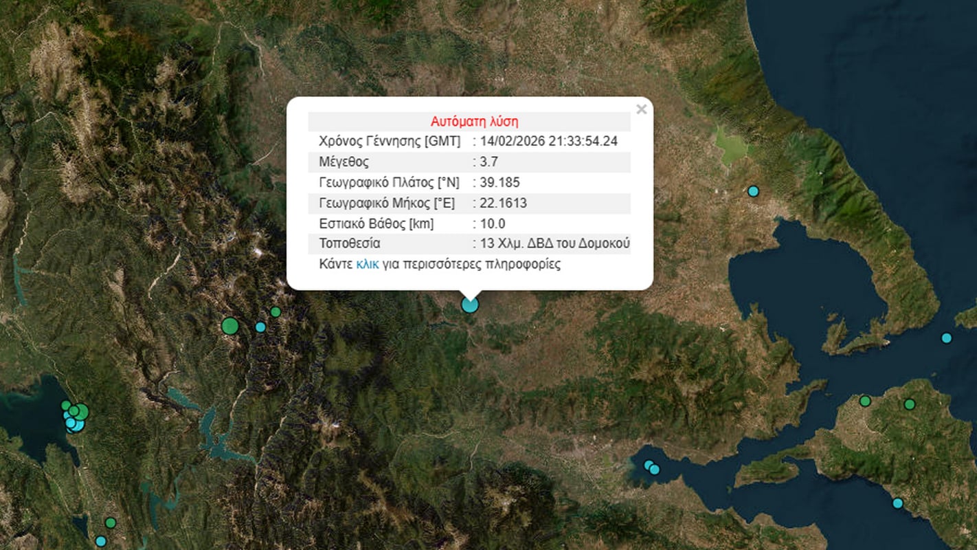 Σεισμική δόνηση μεγέθους 3,7 βαθμών της Κλίμακας Ρίχτερ σημειώθηκε το βράδυ του Σαββάτου, στις 23:33, κοντά στον Δομοκό.